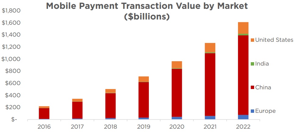The Statista Digital Market Outlook estimates that by 2020, total mobile contactless POS payment transactions will exceed $1 trillion worldwide and $115 billion in the US.