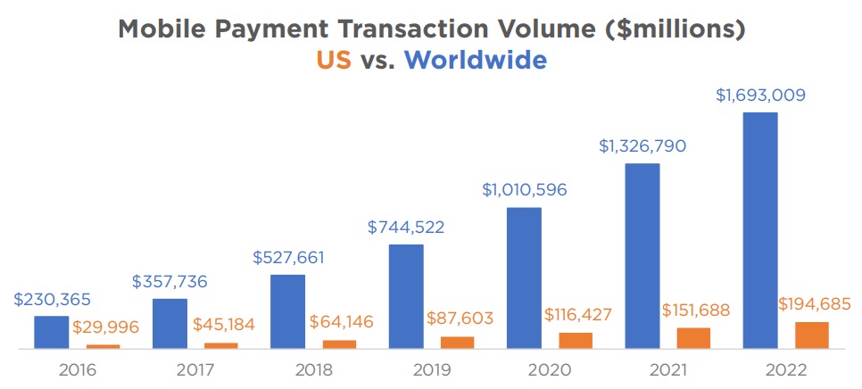 US consumers spend more money using their mobile devices than any other country except China. In 2018, mobile payment transaction volume in the US reached $64 billion – a tiny fraction of total consumer spending (about $40.5 trillion in 2018), to be sure – but second only to the $414 billion in mobile payment volume in China.