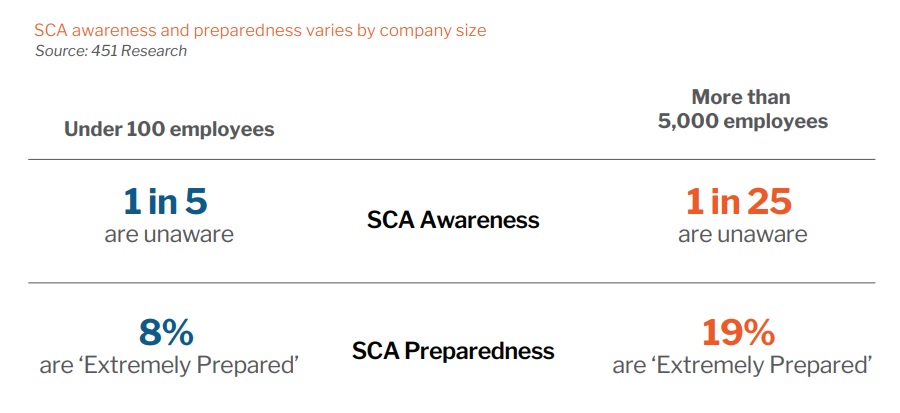 - SCA’s complexity will disproportionately impact small businesses. Three in five businesses with fewer than 100 employees are unfamiliar with SCA, don’t plan on being compliant before September, or are unsure when they will be ready.