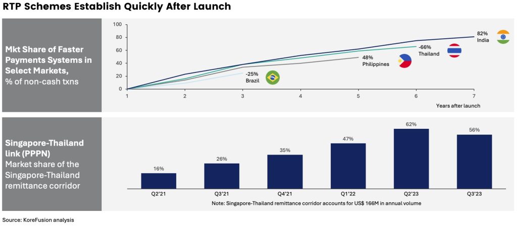 Our analysis of central bank transaction data shows that UPI transactions in India accounted for 82% of all non-cash transactions just seven years after launch, while 65% of remittances in the Singapore-Thailand corridor were RTPs just two years after launch.