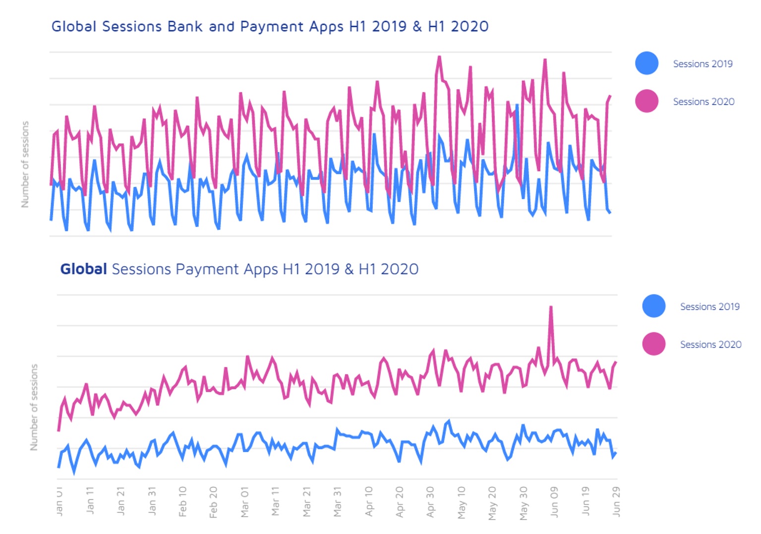 - Sessions for banking and payment apps combined increased 26% on average across the countries in our survey. While all countries saw an uptick in sessions, stand-out markets by growth rates were Japan (142%), Germany (40%), Turkey (31%), and the US (27%).