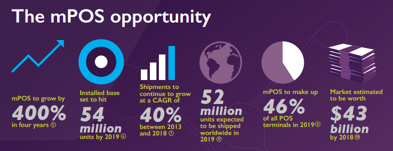 Mobile point-of-sale (mPOS) is revolutionising the POS terminal industry. Because of this, the market is poised to grow by 400% over the next four years, 46% of all POS terminals in 2019 are expected to be mPOS and the market will be worth an estimated $43 billion by 2018.