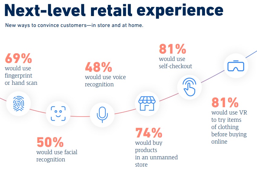 With a self-checkout, a mobile app automatically processes the payment as soon as the customer leaves the store. Most of those surveyed can also imagine paying by fingerprint or hand scan (69%), and over three-quarters (78%) of participants aged between 18 and 44 stated that they would be open to trying on items of clothing using virtual reality (VR) before buying.