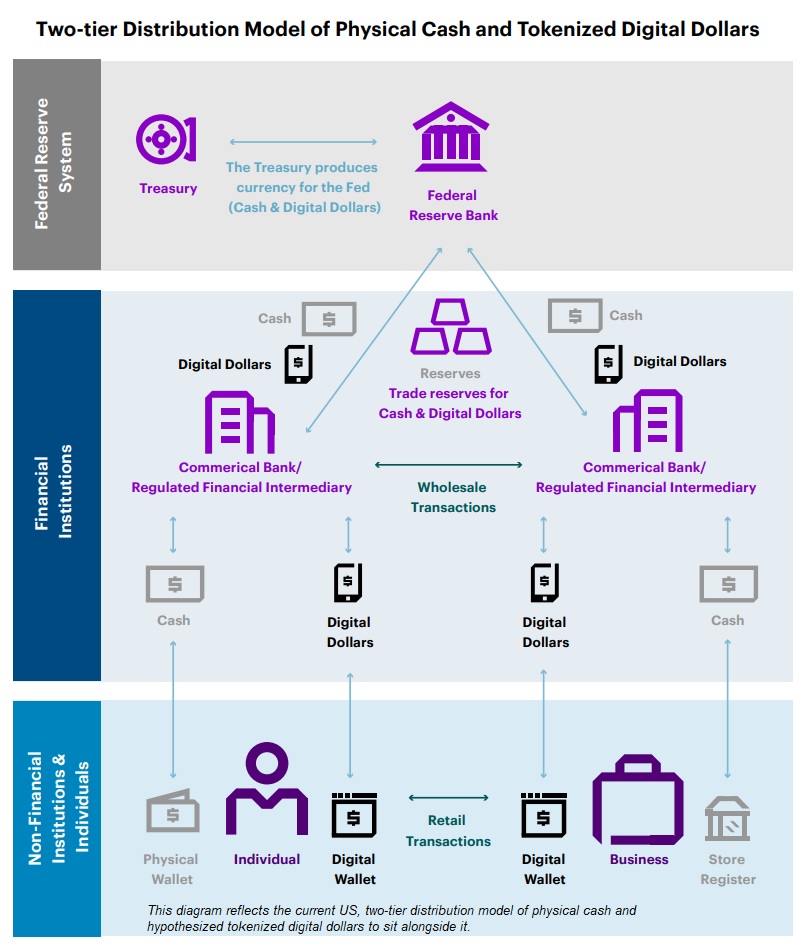 A digital dollar could be distributed to the end user through commercial banks and trusted payment intermediaries while facilitating financial inclusion by broadening access to services via additional mechanisms, such as digital wallets.