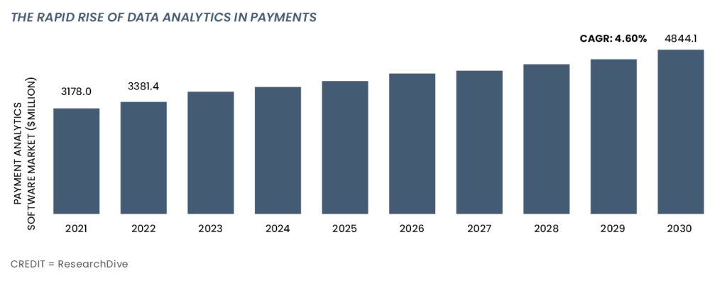 This is big business: ResearchDive estimates the market for data analytics in payments will be worth around $4.8 billion by 2030, growing at just under 5 percent per year to the end of the decade. The reason behind this success is that many banks are coming to realise their transaction data is a strategic gold-mine.