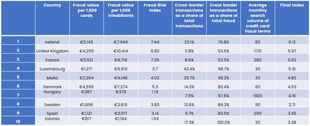 In Ireland, 88 of every 1,000 inhabitants becomes a victim of credit card fraud, which is the third highest amount compared with the other countries in the list, which means for every 1,000 inhabitants, €7,949 is stolen by fraudsters.