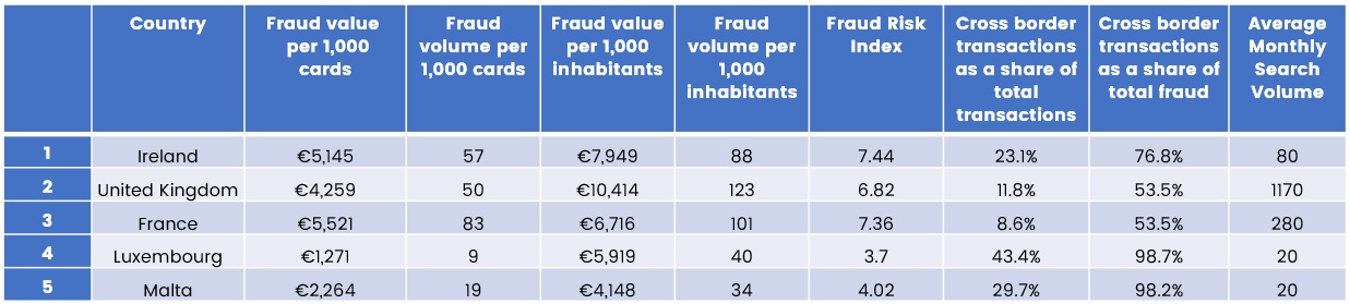 Out of all of the 19 countries  researched, Ireland loses the second highest amount of money to fraud per 1,000 cards with €5,145 and each month, there are 180 searches for the terms ‘credit card fraud’ and ‘report credit card fraud’.