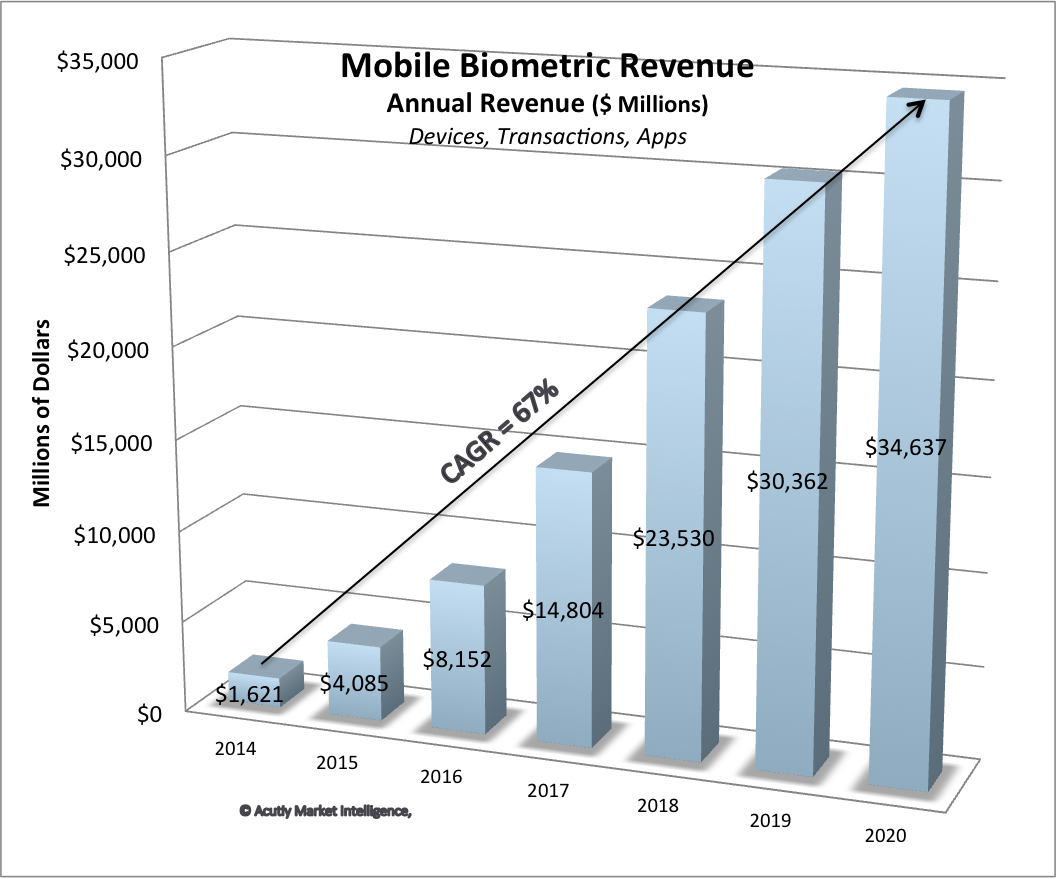 Mobile biometric revenue“Biometrics and digital identity are often perceived as threats to privacy and security,” comments Maxine Most, Principal of Acuity Market intelligence. “However, taken together these technologies have the potential to enhance privacy, increase personal data control, and shift power relative to the monetization of consumer data.”
