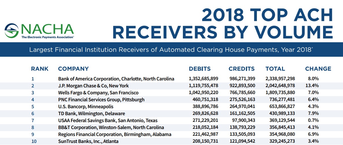 NACHA has released its Top 50 rankings of originators and receivers of ACH payments for 2018.