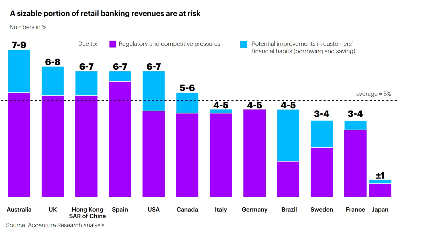 The report, titled “Purpose-Driven Banking: Can Trust Create Win-Win Banking Relationships?,” is based on quantitative analysis of retail banks’ revenue pools across 12 markets in Europe, North America, South America and Asia-Pacific and was complemented by a survey of nearly 15,000 banking customers in those markets. It found that the revenue that traditional banks generate from overdraft and other fees and from charges for services like cross-border payments and foreign transactions will erode as a result of both competitive and regulatory pressures, resulting in an average revenue loss of 5%.