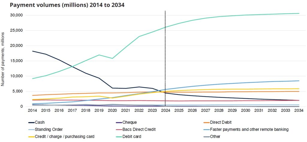 By 2034, card payments are expected to account for 67% of all transactions, contactless to represent 43%, and cash just 4%.