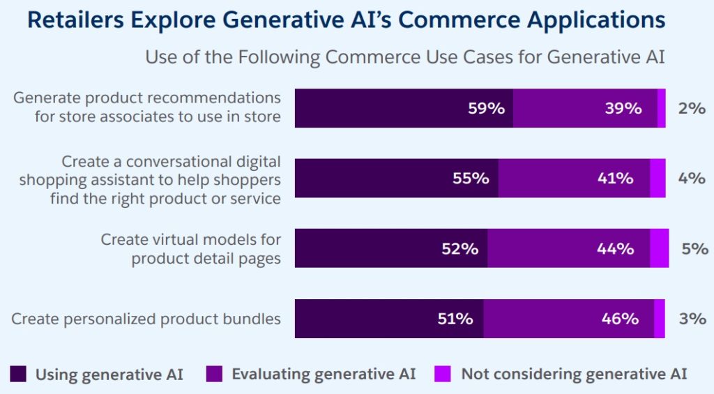 12% say they’ve already used generative AI for shopping inspiration.In response, retailers are busy evaluating how generative AI will play a role in customer engagement and operations, if not actively implementing it in their workflows. Popular use cases include generating marketing assets and personalised customer service responses.
