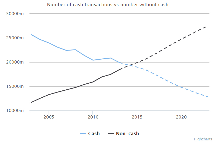 The number of cash transactions will drop to just under 13 billion by 2023, while the number of cashless transactions – including cheques, credit cards, debit cards, contactless cards, direct debits, and standing orders – will rise to over 27 billion.