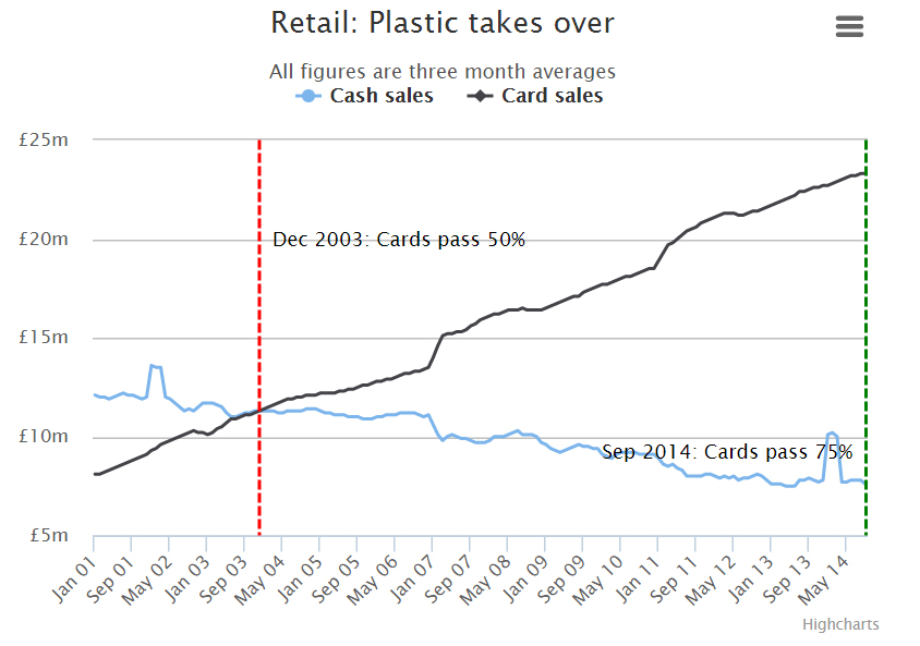 According to the UK Cards Association, credit cards and debit cards surpassed cash in terms of value more than a decade ago, in December 2003. They now account for more than 75% of the retail sales.