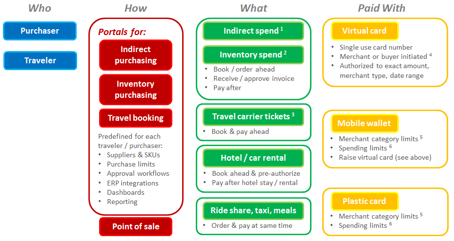 1 Office suppliers, parcel delivery, and other miscellaneous business expenses that are not included in cost of goods sold. 2 For purchase of inputs into cost of goods sold. 3 Such as airfare or train tickets. 4 With a merchant initiated transaction, a card number is provided to a merchant to input the card number in a physical or virtual card terminal. For a buyer initiated transaction, the buyer requests a merchants’ card acceptance depository account details in advance and the buyer inputs the card number to initiate a transaction into this card acceptance account. 5 For example, can only complete transactions at merchant types A, B, and C – or – may not complete transactions at merchant types D, E, or F. 6 For example, cannot exceed X dollars per transaction, Y transactions per day, or Z transactions per billing cycle.