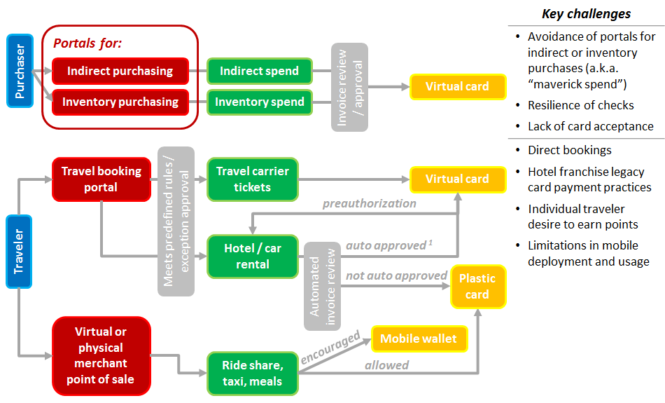 Within client organizations, these and other trends, evidenced through numerous recent innovation-related announcements by commercial card networks and issuers, could support CFOs, CPOs, and other organizational decision makers in driving a more coordinated and user-friendly pursuit of business process automation for corporate travel and purchasing. Figure 1 illustrates several key components for this card-based automation.