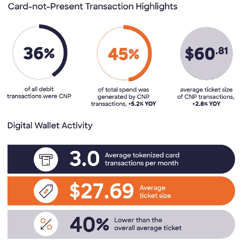 Card-Not-Present transactions account for 45% of debit spend; 38% of debit cards are loaded into mobile wallets.