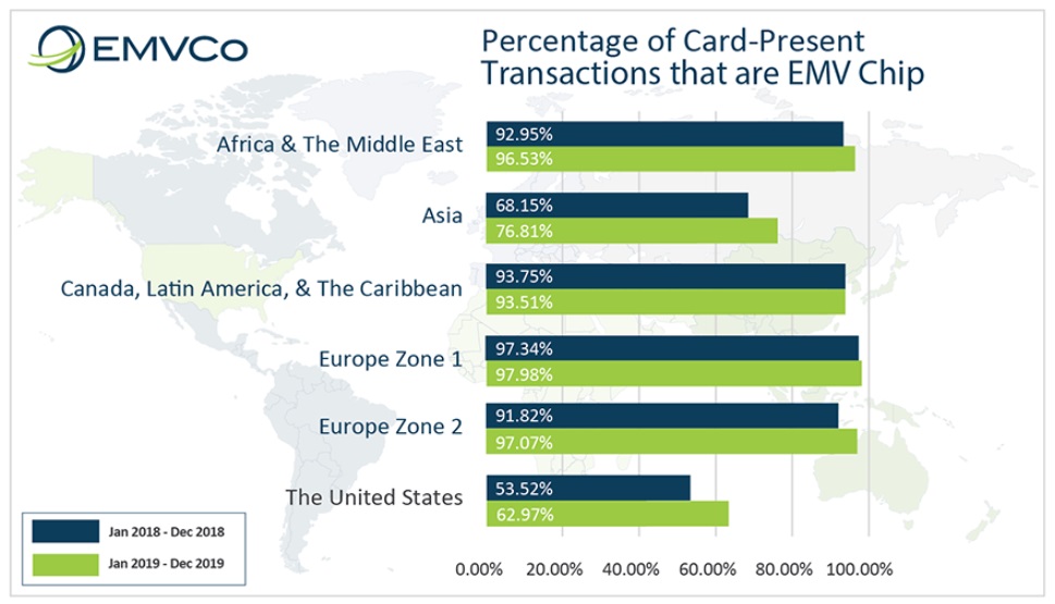 EMVCo, the governing body that manages EMV card interoperability, released its December 31, 2019 statistics which revealed that the US had 1.074 billion EMV chip-enabled credit, debit and prepaid cards deployed compared to 1.04 billion for Western Europe, which is represented as Zone 1 in its data. Only the US is represented as a single country zone in EMVCo statistics, whereas all other countries are grouped into various regions.