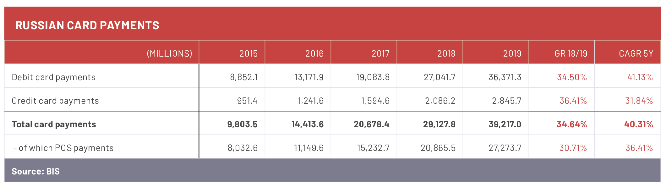 This is part of a long-term trend, as the five-year growth rate shows: what’s more, while Eurasian numbers are from a lower base, the “cards-per-capita” figure demonstrates that it’s not all about catching up. Eurasia now boasts 1.5 cards per capita, compared with 1.68 across the EU.