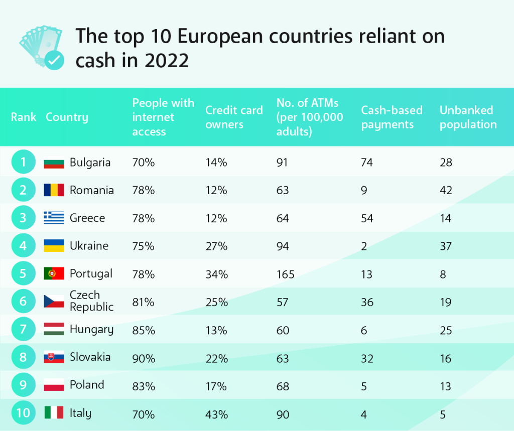 The research reveals that Bulgaria is the most reliant country in Europe with a cash reliant score of 8.35 out of 10 on the index. Bulgaria has the lowest percentage of people with access to the internet out of the countries studied (70%), meaning digital payments are off bounds for many.
