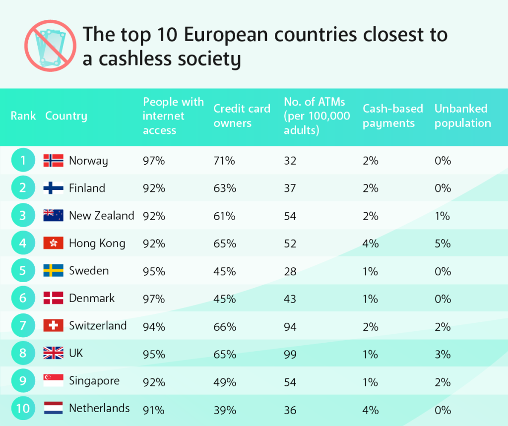 The close-by country of Finland follows Norway, with the same small percentage of cash-based payments (2%) and none of its citizens going without a bank account.