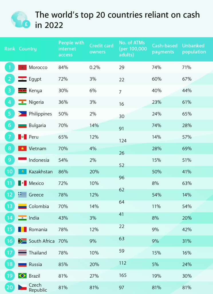 Fellow African countries Egypt and Kenya follow in second and third after Morocco. 60% of all payments in Egypt are cash-based and 67% of the population don’t own a bank account, whereas in Kenya only 40% of payments are cash-based and less than half the population are unbanked.