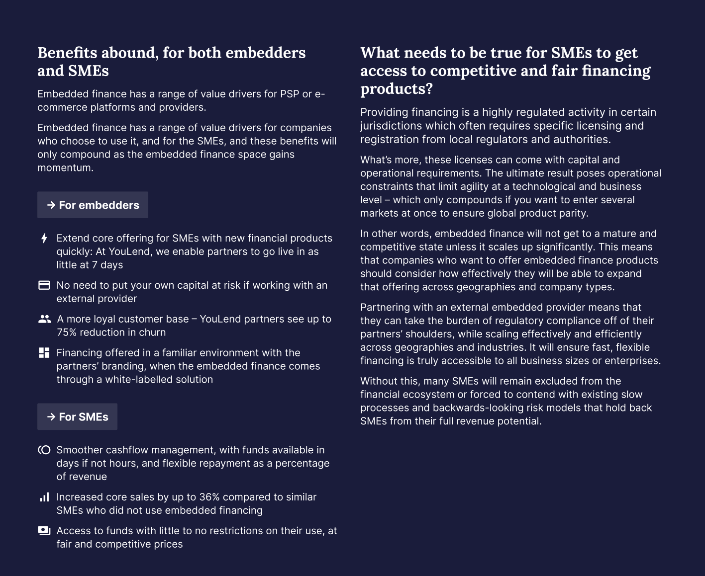But embedded financing is changing all of that, according to Mikkel Velin, co-CEO, YouLend. Through the use of alternative data sources that provide a more sophisticated assessment of SMEs, and quicker processes that allow merchants to complete applications within minutes and receive an offer immediately, more SMEs can access financing than ever before.
